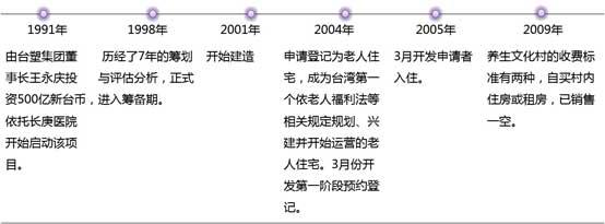 項目源起:臺灣“經營之神”王永慶為紀念其父親王長庚所創辦長庚醫院。2004年,依托長庚醫院的醫療資源,臺塑集團建立了長庚養生文化村,成為面向“銀發一族”的集養生、醫療一體化經營的項目。